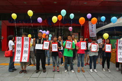 抗議員工手施放貼有抗議標語的汽球,象徵工會與資方協商時,能夠善待員工。曾伯愷攝