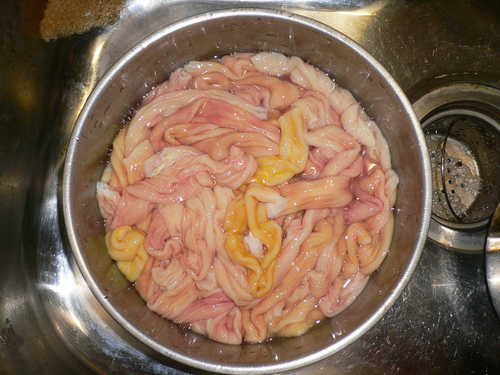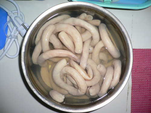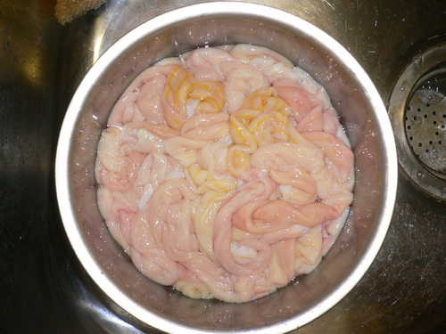 先把腸子外旁邊的腸油剪一些掉(因為我不敢吃太肥油的)