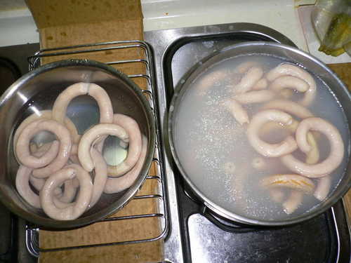 用熱水.先川燙一下(右邊正在燙.左邊已撈起)