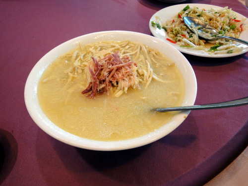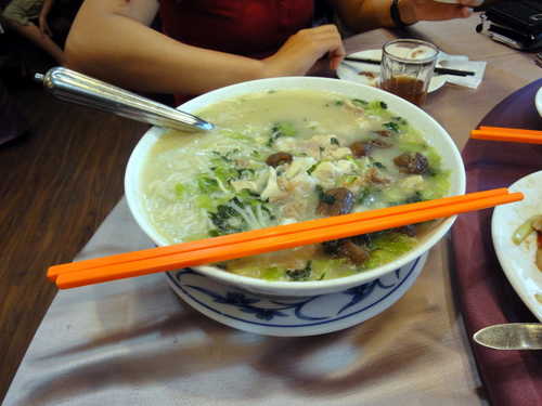 店家以老母雞湯加上火腿絲和雞絲一起烹煮,不會鹹.