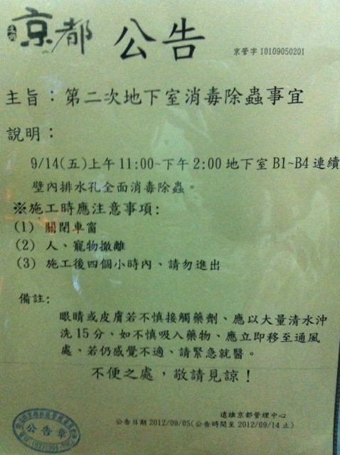 第二次地下室消毒除蟲公告 9/14(五)/2012 11:00~14:00