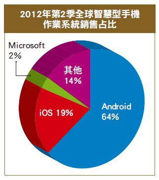 另在深化與微軟合作後,也能利用不同平台為智慧型手機做出的產品差異性,更可加強較弱的平版及NB產品競爭力。過去Android在智慧型手機版圖之所以能如此迅速擴張,就是靠主力大將的三星替他打下一片江山(根據Gartner報告指出,Android今(二○一二)年第二季在全球智慧手機市占率由去年同期的四三%飆升到六四%,其中三星貢獻整體出貨量的四四%),如今三星轉向擁抱微軟,其龐大的出海口能否推升Windows成為能夠與iOS及Android相抗衡的第三勢力,是值得留意的產業發展趨勢。
