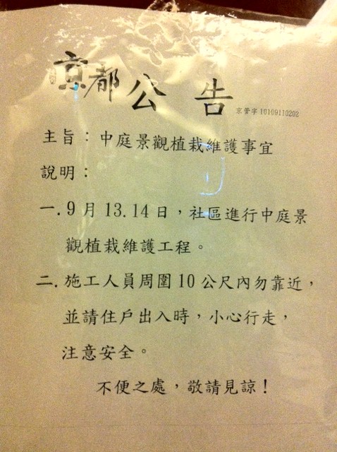 中庭景觀植栽維護 公告 9/13(四) & 14(五)/2012
