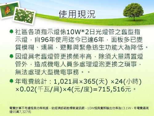 再者,社區時而購買大量10W燈管更換,耗材支出也頗可觀,機電人員耗費大量時間更換燈管與維修。