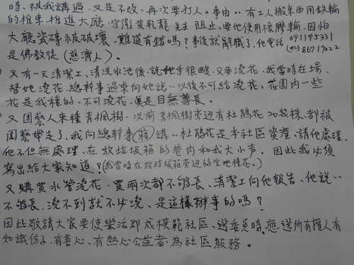 另外,感應燈的部份,一直有住戶來反應安裝,這在區全會上也被討論過,