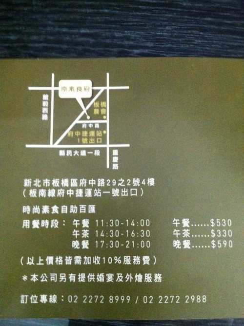 餐廳位置/營業時間/價位 (每星期一是環保日, 午晚餐有特價). 由北大特區可以搭乘 932 在府中站下車, 往捷運站一號出口方向走, 原素食府在右手邊, 它的招牌很大, 不會找不到.