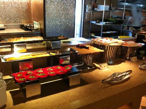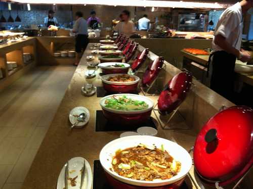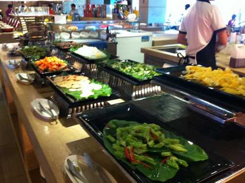 自助餐台的設計以一區一特色為主調, 有沙拉/小菜/熱炒/麵/麻辣燙/冰/甜點等, 素食的內涵豐富多變:
