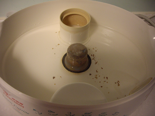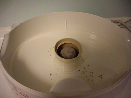 拿掉中間的小塑膠圈,中間的部份,就是發熱器。其實他的設計原理很簡單,也很有效率。若是使用一般的蒸爐,是會將所有的水都煮到高溫之後,產生大量的水蒸氣,但是這樣若是使用蒸氣量不大時,就浪費很多的電能。而這一台的設計,就是將加熱範圍,使用那一個小塑膠圈來限制(也就是說,只加熱塑膠圈中的水),這樣就可以使用最少的電能,快速的產生出蒸氣了。幾乎在 2 分鐘之內,那蒸爐就會全部都是水蒸氣了。非常有效率的一個產品哦!
