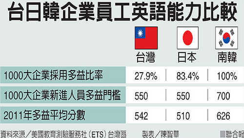 首份台、日、韓千大企業外語能力調查指出,台、日、韓企業中,韓企英語力居冠,台企若不改變,國際優勢將再下滑。