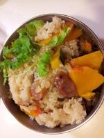 米炒到有點變透明狀, 吸飽了湯汁以後, 轉戰電鍋, 上面鋪上切好的南瓜. 外鍋放2杯水, 蒸
