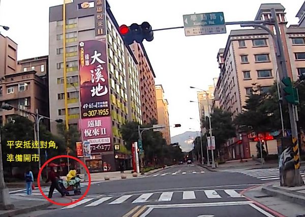 阿伯拖著沉重的菜攤, 緩步越過路口... 一次過兩個