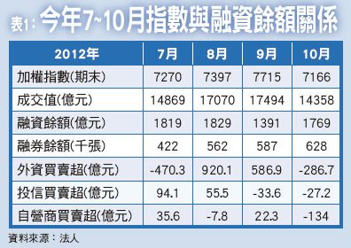 其次,今年七月以來融資餘額,九月時曾降至一三九一億元,但當月大盤指數堅守在七千點之上,因此欲窺融資餘額與指數關係,可以從七月二十五日與二十六日兩次先後跌破七千點於六九七九、六九七○點,當時融資維持率約一四二∼一四三%,接著反彈至九月十九日的七七八一點。此次大盤於十月二十九日下殺至七○九一點,而融資維持率則降至一四○%時開始彈升,因此推估短線應該有上看七五○○點機會。