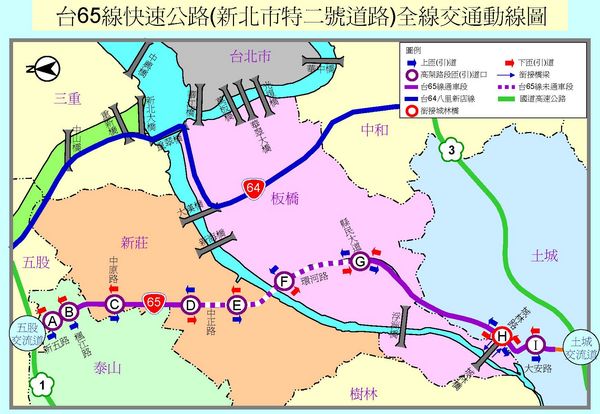 吳國濟說,台65線全線通車後,將改變沿線用路人的行車習慣,大台北一小時生活圈成形。更重要的是紓解新莊區中正路交通瓶頸,他說,目前台65線下新莊中正路匝道,為增加儲車空間所規畫的路口交通動線,到時也會跟著調整。
