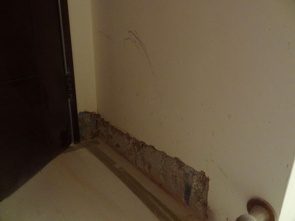 後來我家因為拋光磚裂,同一部位重工兩次導致踢腳板位置含水過高發霉,