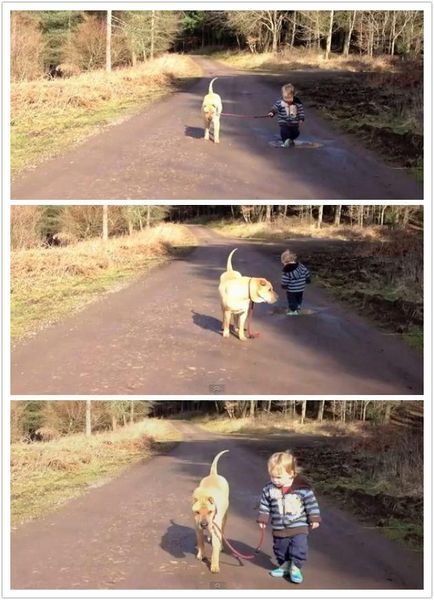 一段今年3月上傳的影片,最近又在網路熱傳,1分04秒裡,3歲的小主人Arthur牽著12歲的沙皮狗Watson散步,看似尋常的互動,吸引上百萬人次的點擊,溫暖人心的關鍵就在Arthur的「動」與Watson的「靜」。