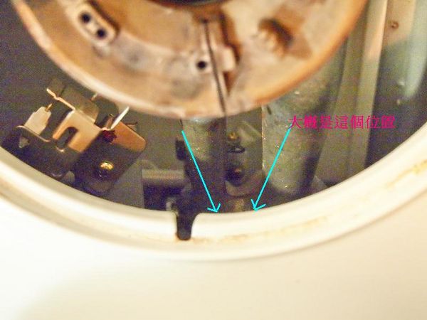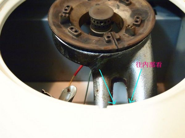 2. 往內部檢查,與點火器連接的鐵管下方有一塊凹型厚保麗龍撐住鐵管