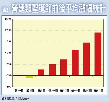 事實上,營建業年底衝刺業績,順勢都能激勵股價走勢,從歷年數據觀察即是如此,若再加上前述題材面,類股短線確實值得留意。理周投研部表示,當外資聖誕節開始休長假,由內資主導時,營建股會是內資頗為青睞的標的,一是籌碼穩定,二是擁有不錯基本面,其中營建類股是最典型者。