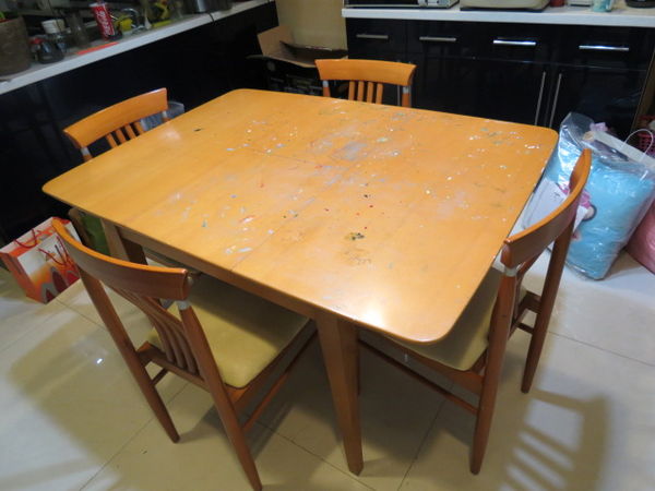 優質實木餐桌,一桌四椅,桌面上有留下我內人作畫的顏料,可以清洗宛如全新,原價35000 ,賣4900,只有一組