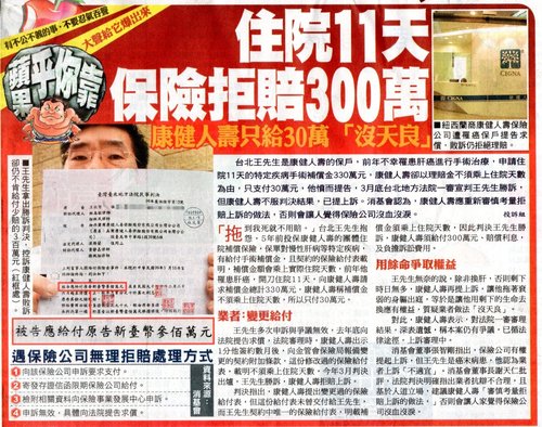 王先生多次申訴與爭議無效,去年底向法院提告求償,法院審理時,康健人壽出示1分他簽約數月後,向金管會保險局報備變更的契約附加條款,這份修改過的保險給付表,載明不須乘上住院天數,今年3月判決出爐,王先生勝訴,康健人壽拒賠上訴。