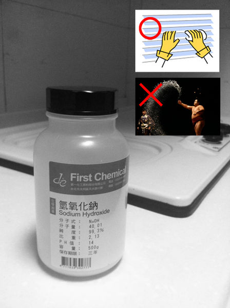 ◎氫氧化鈉溶解時會產生輕煙及高溫,避免吸入以產生不適,建議穿長袖衣服,因為我在溶解氫氧化鈉時手臂及脖子偶爾會覺得刺刺癢癢的,應該是薰到溶解時冒出的氣體,用自來水沖沖就好了。