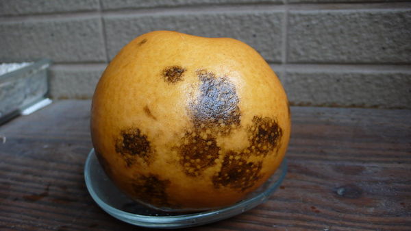 新鮮雪梨,放在冰箱,2-3天後外皮顏色開始有黑斑,放越久越大片,削皮後,果肉雪白沒有變色。