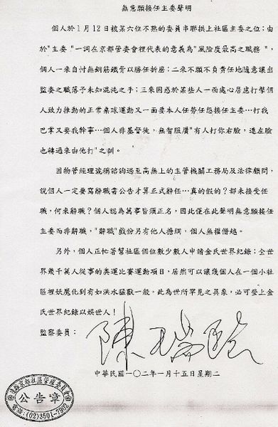 102.1.15 社區公告之監委無意願接任主委聲明書