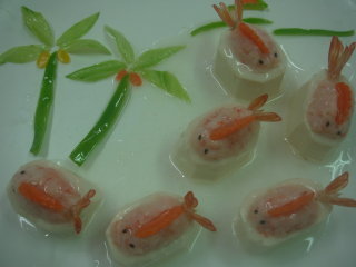 (2)針對201、202、203三大題,每大題分A、B、C、 D、E五組, 每組7道菜,共105道菜。 如: 麒麟蒸魚、燻雞、蒜子燒黃魚、威化香蕉蝦捲、洋菇海皇羹、碧綠雙味菇、八寶封雞腿、果律蝦球、珍菇翡翠芙蓉羮、蔥油灼墨魚片、玉樹上雞湯、煙燻黃魚、掛霜腰果、拆燴黃魚羮…等105道新菜色,刀工、火侯、食雕、盤飾、衛生重點的教學。