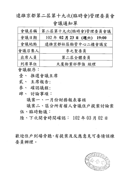 第二屆管委會第19次(臨時會)議程 通知 102.2.23(六) 19:00 p.m.