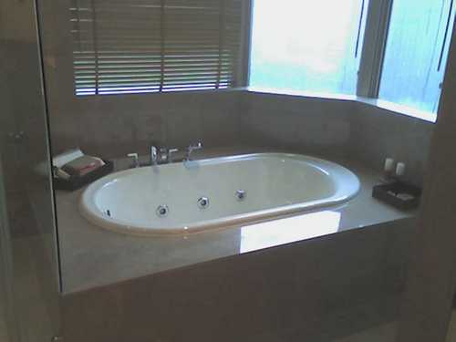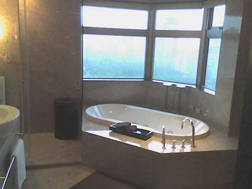 但是浴缸旁的落地窗要再低一點才看得到風景吧...