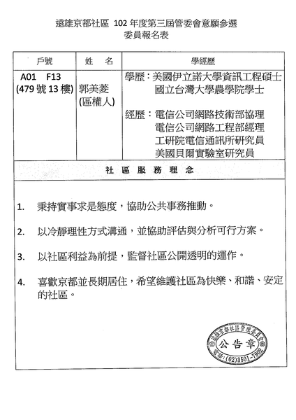 社區公告第三屆委員登記意願參選人【A01-13F】