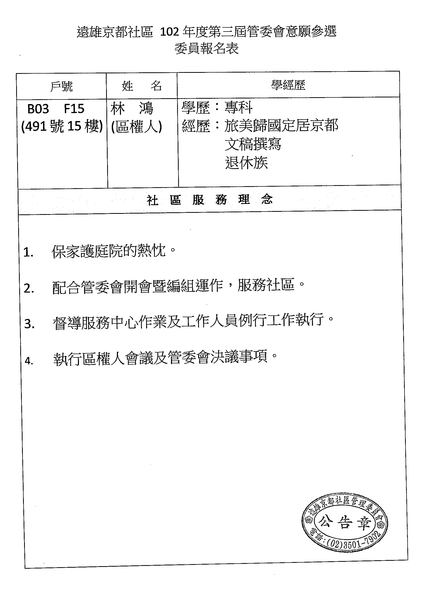 社區公告第三屆委員登記意願參選人【B03-15F】