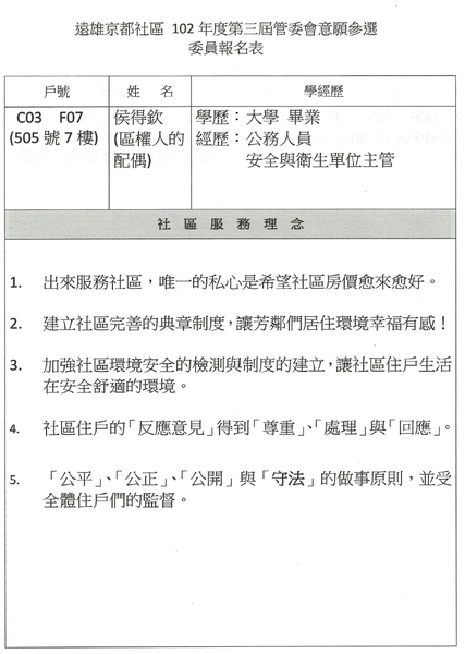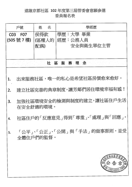 社區公告第三屆委員登記意願參選人【C03-07F】
