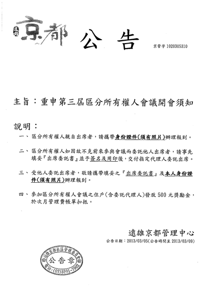第三屆區分所有權人會議開會須知