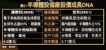 理周投研部表示,半導體設備廠股價飆漲原因,大致包含五大DNA,第一是,公司電子束檢測技術領先競爭同業,招允佳表示,漢微科擁有電子跳躍式掃描專利技術,可快速檢測高風險區域的電性狀況,遠優於對手。第二是,全球市占達八五%,具龍頭地位。第三是,半導體產業對電子束檢測需求日益成長,挹注漢微科業績持續亮麗表現。第四是,大客戶支持。