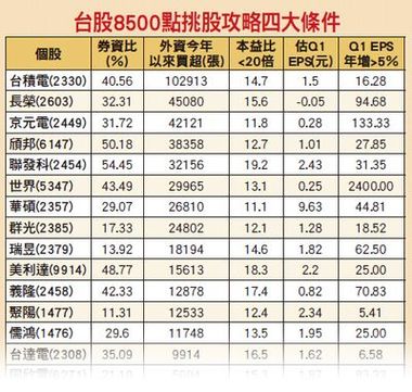 理周投研部特別設定四大條件選股,其一是本益比仍低於二十倍者;其二,外資今(二○一三)年以來買超千張以上者;其三,第一季每股獲利年增率大於五%;其四,券資比大於一○以上者。