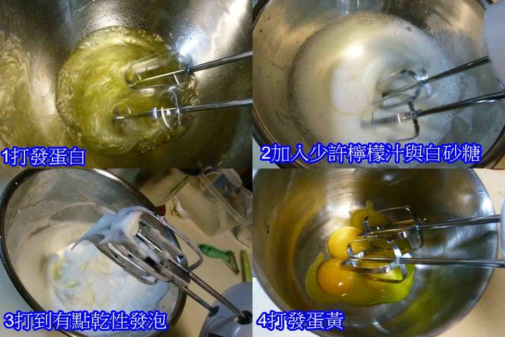因為我的速度比較快,所以習慣先打發蛋白之後,用水沖洗打蛋器並擦乾後,再打蛋黃糊。