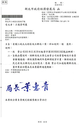 北大特區設立郵局的案子,已經過中華郵政經營策略設計委員會審議通過了,之後將編列年度預算,辦理郵局興建跟投資計畫。
