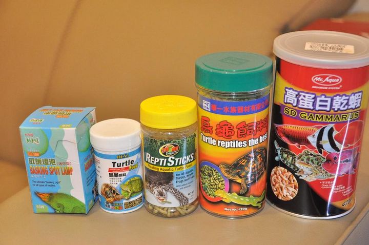最左邊是爬蟲類專用燈泡,最右邊是乾白蝦(照顧龜殼),中間三種是不同牌的飼料