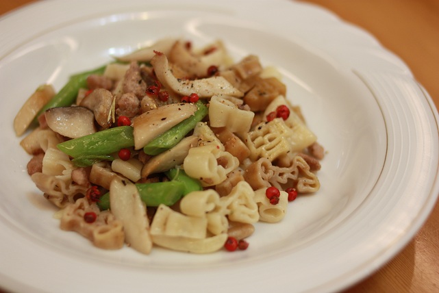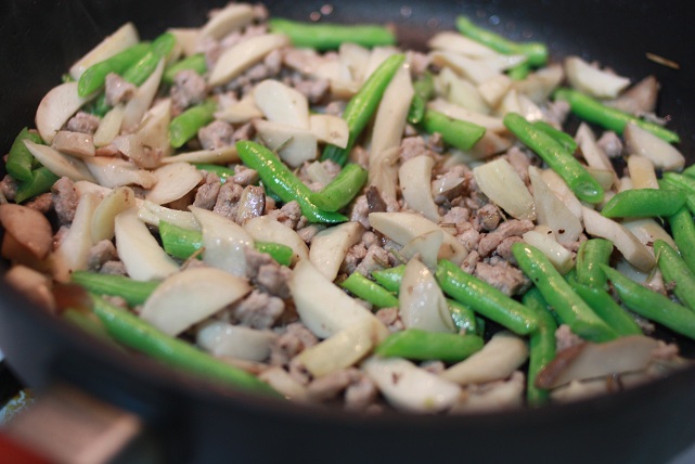 食材: 義大利麵/橄欖油/大蒜/杏鮑菇/四季豆/絞肉少許/綜合胡椒/迷迭香/百里香/海鹽