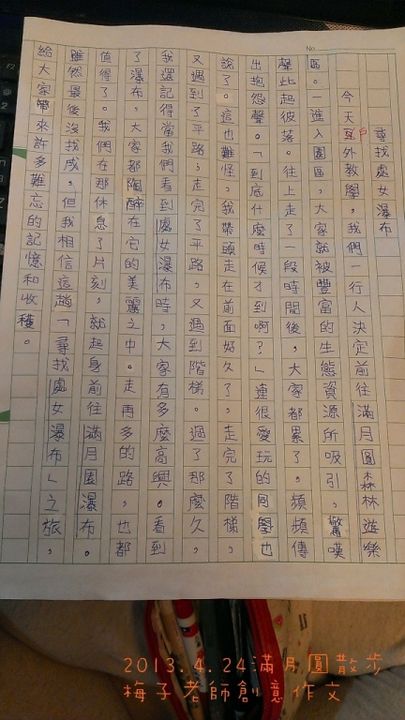 一路上,九個孩子,兩個大人,在清涼氣息裡聽見鳥叫、蛙鳴,感受冰涼泉水,感受這種漫步的悠閒。即使這一趟旅程加起來的運動量,是我好幾個禮拜的份量,聽見到達處女瀑布的他們說:「我們還要去滿月圓瀑布。」說服了不想再走的同伴,全部都願意接受挑戰的決心,再累也要開心陪下去!
