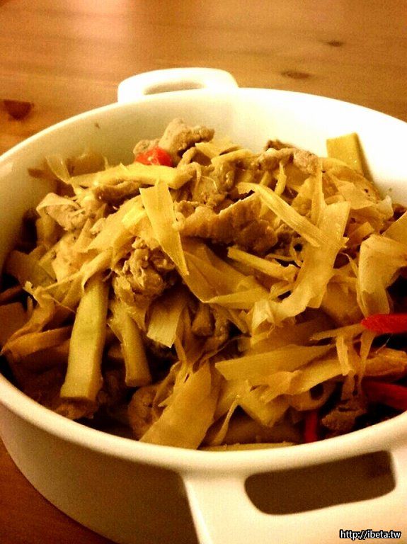 下蒜末,辣椒段與肉同炒,炒熟後,下筍子