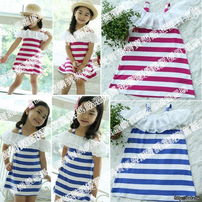 24.女童條紋露肩吊帶連身裙$180(藍色100 110)