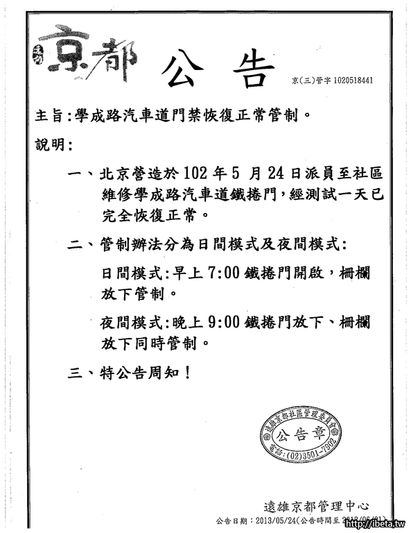學成路汽車道門禁恢復正常管制