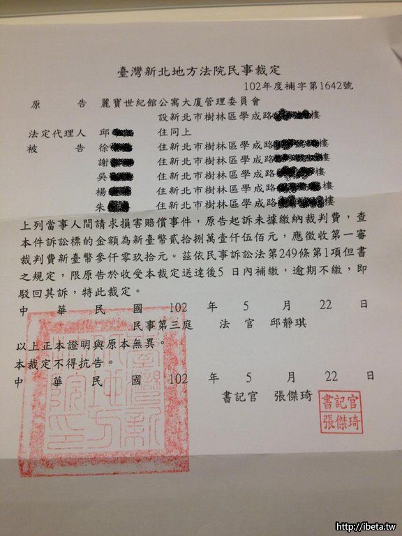 今天收到新北地方法院民事裁定書,貴管委會大人指定某位委員對第二屆五位委員提告,其中還有兩位委員續任第三屆,這樣同室操戈管委會要怎麼運作下去呢?到底被告的五位委員得罪了貴管委會甚麼地方?需要用到法律的手段來對上屆委員進行訴訟呢?