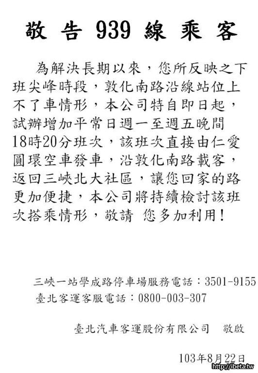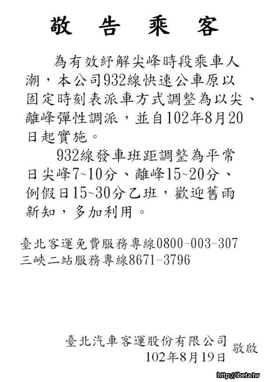 台北客運已經同意配合將932線由現行末班車22:00由三峽發車,延後至22:20時