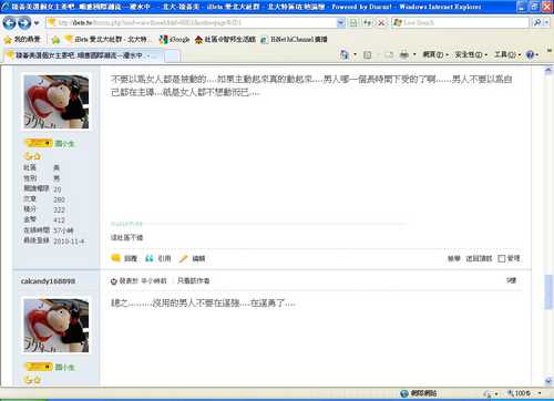 我看到了...不管要諷刺男人還是罵男人...正大光明來阿!!不要用暗喻手法~這邊應沒必要這樣吧??而且公開的版面,用詞遣字還是文雅一點的好!!畢竟,說話的人說出來的...就代表自己的水準與涵養吧{:4_90:}