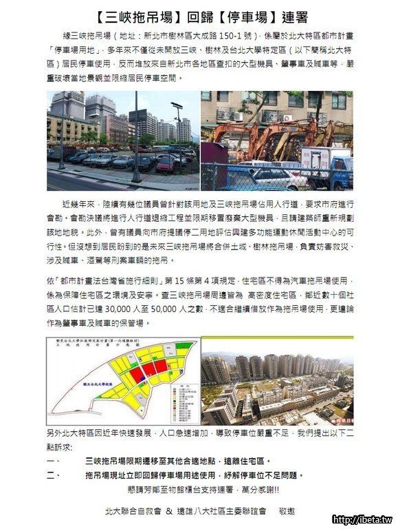 附檔為:通報-三峽拖吊場回歸停車場聯署